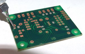 Löten Das vorbereiten der Platine läuft bei mir wie folgt ab. Reinigung der Lötaugen und Pads, dazu verwende ich eine schwache Lösung aus Batteriesäure und Ammoniumpersulfat (anätzen nur 20sec). Dann spülen, trocknen und mit Fluxmittel einpinseln. Im Bild der Auftrag der Lötpaste mit Pneumatik Dosiergerät. Mein Dispenser ist eine Eigenentwicklung, die benötigte Luft kommt aus der Flasche, also kein Kompressor, hat ein Fußpedal für Dispensen und ein Fußpedal für das Umschalten der Dosiermenge in drei Stufen (die Größe der Pads). Die Luft für diese Anwendung reicht nahezu ewig, auch wenn wir hier nur 8bar mit dem Kompressor reingedrückt haben. Die ganze Sache kann man sogar in der Wohnstube machen ohne das es Zoff gibt. Mehr dazu bei den Projekten. | ||||||||||||||||||||||||||||||||||||||||||||||||||||||||||||||||||||||||||||||||||||||||||