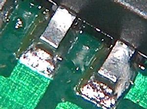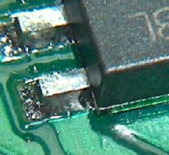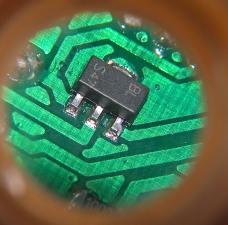 in den nächsten drei Bildern Nahaufnahmen mit Vorsatzlinse von einem Transistor, Der Lötstop funktioniert. Gut zu sehen die feine Struktur, der Glanz der Lötstopmaske, das blasenfreie Ergebnis. Im Bild 2 ist zwischen dem Pin 1 und 2 ein glänzender Punkt, es handelt sich hierbei um sogenannte Sateliten, das sind abgesprengte Lötperlen aus der Lötpaste, was in Fachkreisen durchaus normal ist. Nur Überhand solls nicht nehmen. | ||||||||||||||||||||||||||||||||||||||||||||||||||||||||||||||||||||||||||||||||||||||||||