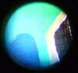 Der Ausschnitt unter dem Mikroskop, rechts ein Stück Lötauge das vom Lötstop frei ist. Die Struktur ist perfekt gelungen. Leider bringen die vorangegangenen Bilder mit ca. 80KB den Reiz der Sache nicht ganz so gut rüber. | |||||||||||||||||||||||||||||||||||||||||||||||||||||||||||||||||||||||||||||||||||||||||